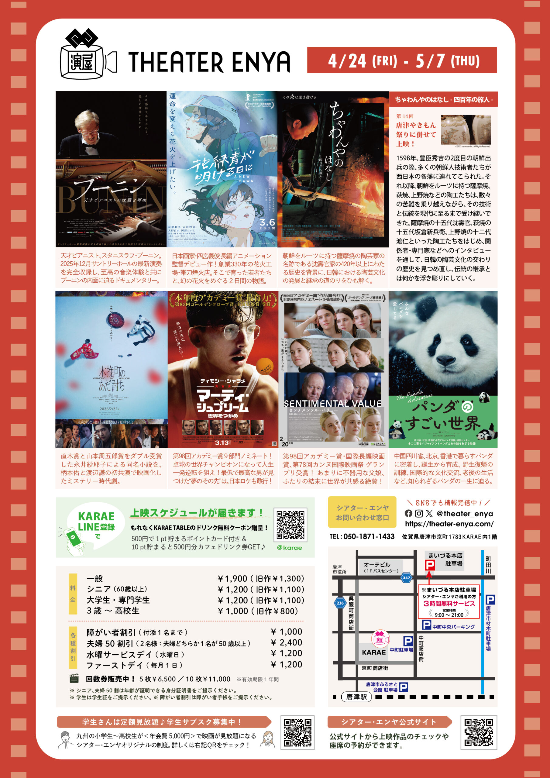 KARAE1階にある映画館シアター・エンヤより、4/24~5/7の上映スケジュールのお知らせです。