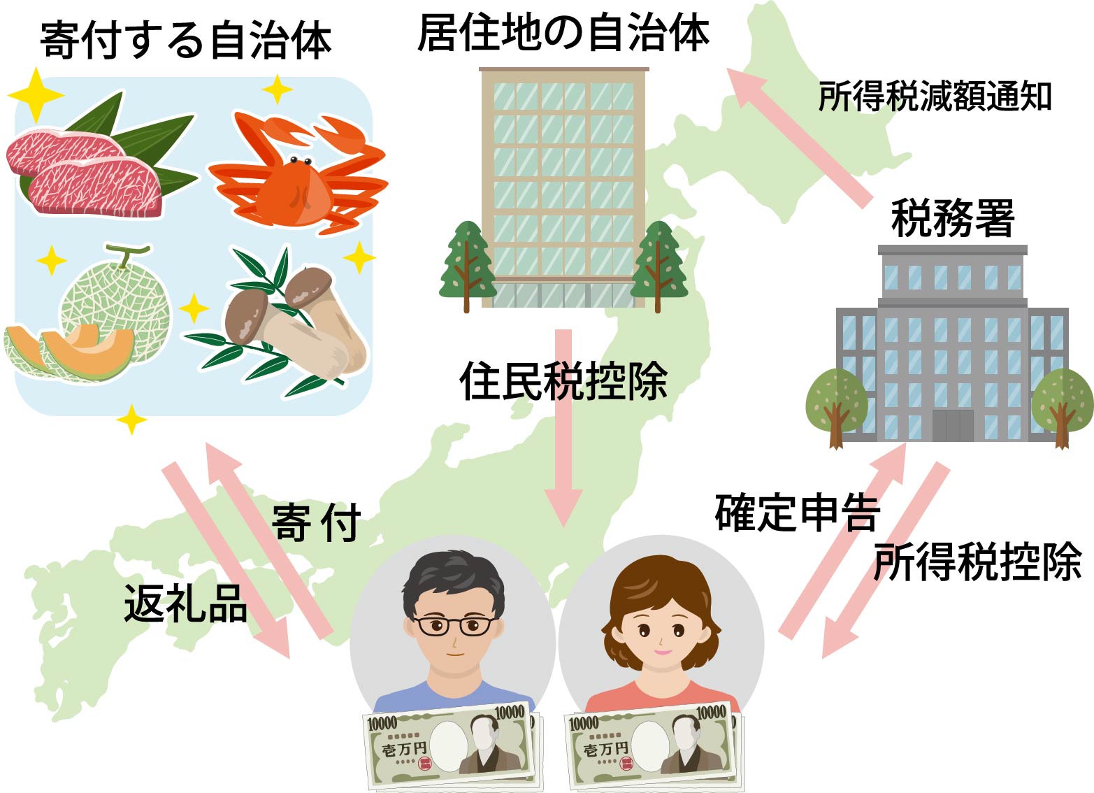 ふるさと納税の基本的な仕組みは、「寄付をして返礼品を受け取り、かつ税金控除が受けられる」というものです。例えば、1万円をある自治体に寄付した場合、その金額のうち2,000円を超える部分(この場合8,000円)が所得税や住民税から控除されます。