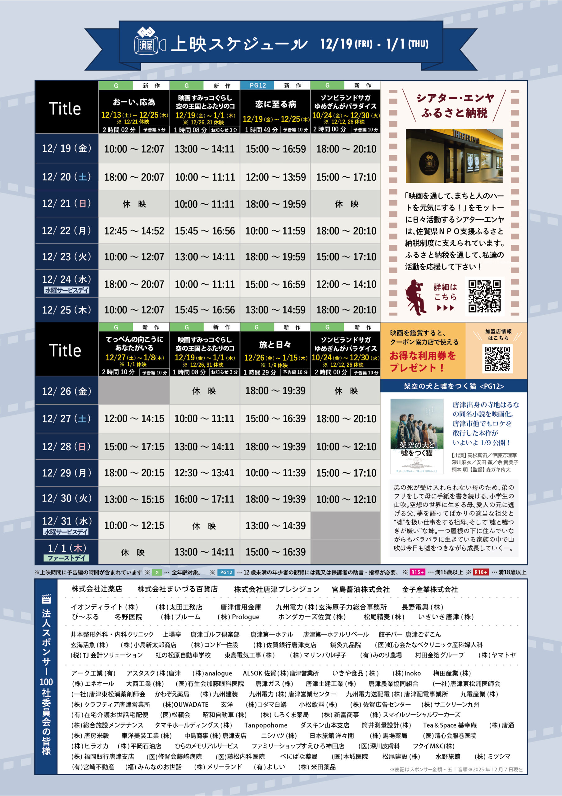 KARAE1階にある映画館シアター・エンヤより、12/19~1/1の上映スケジュールのお知らせです。
