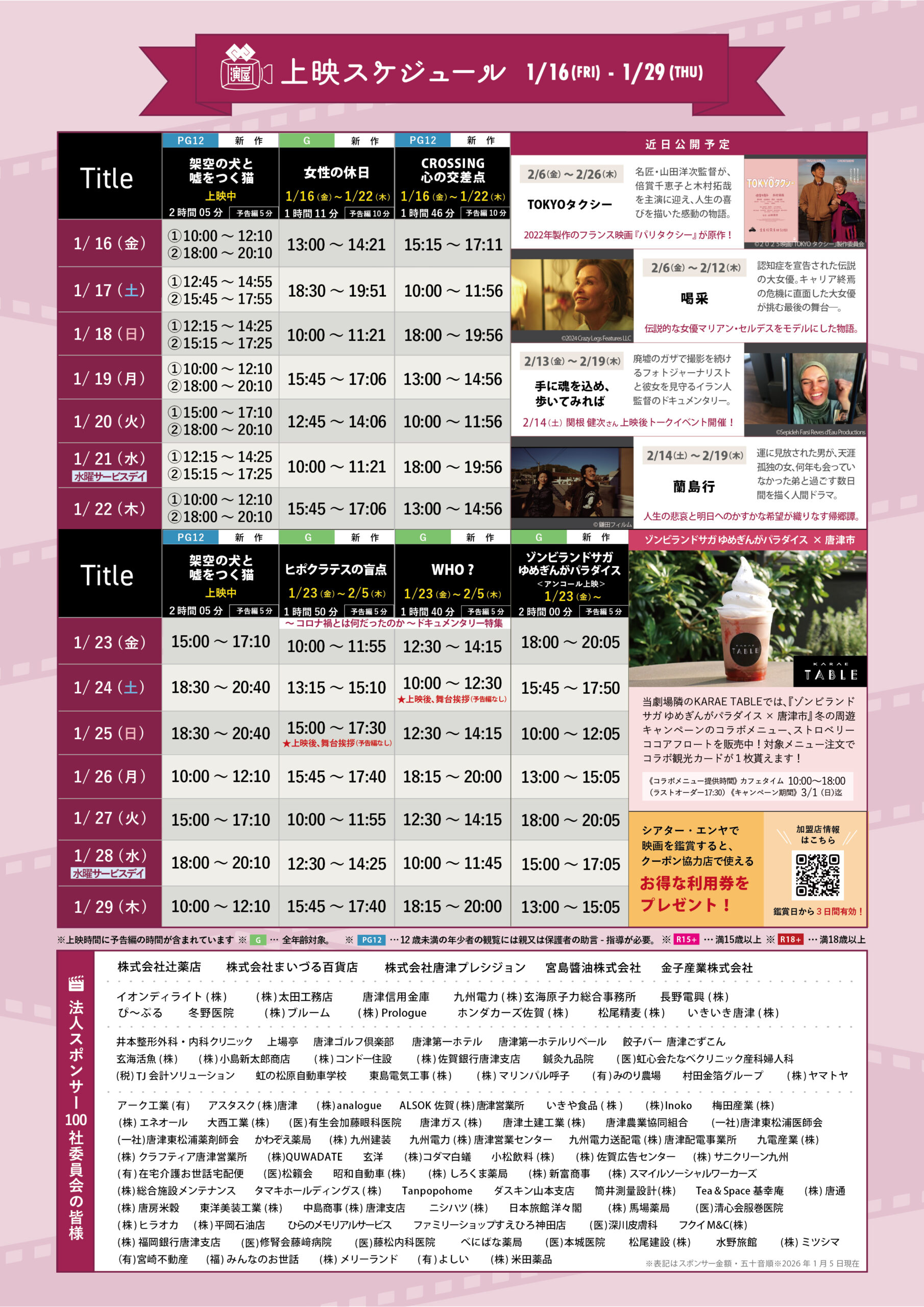 KARAE1階にある映画館シアター・エンヤより、1/16~1/29の上映スケジュールのお知らせです。