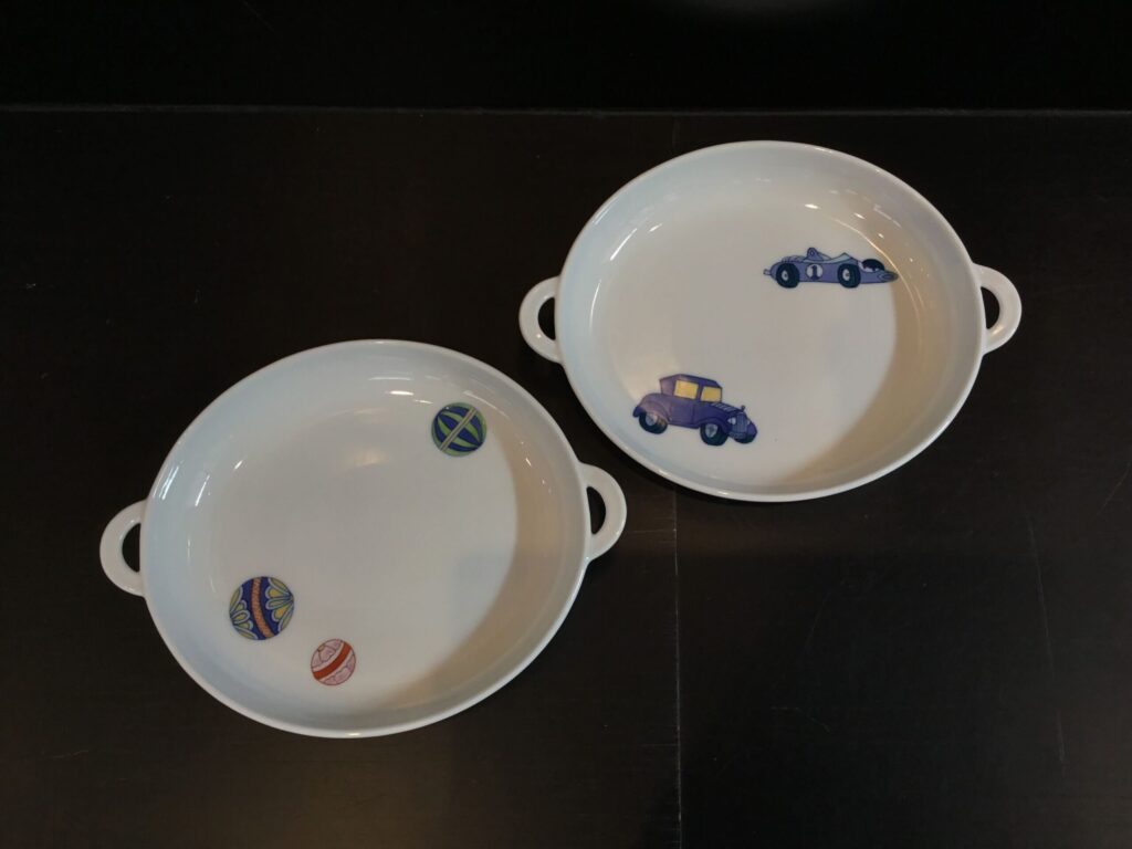 秘窯の里・大川内山からお届けする伊万里焼の子供食器。繊細な筆致のクラシックカーが斬新な、湯呑みと耳付きプレートです。