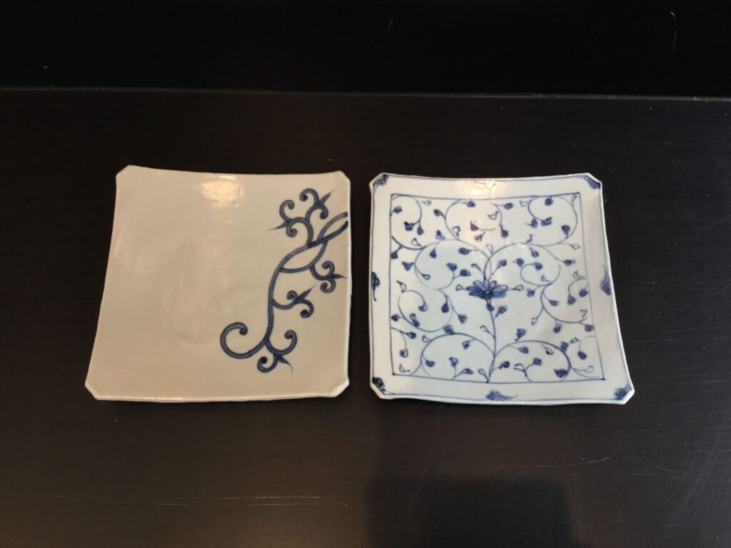 有田焼ブランド・アリタポーセリンラボの角皿2セット。天平窯・岡晋吾がデザインを手がけ、柔らかな手仕事の絵付けが食卓を品よくまとめます。