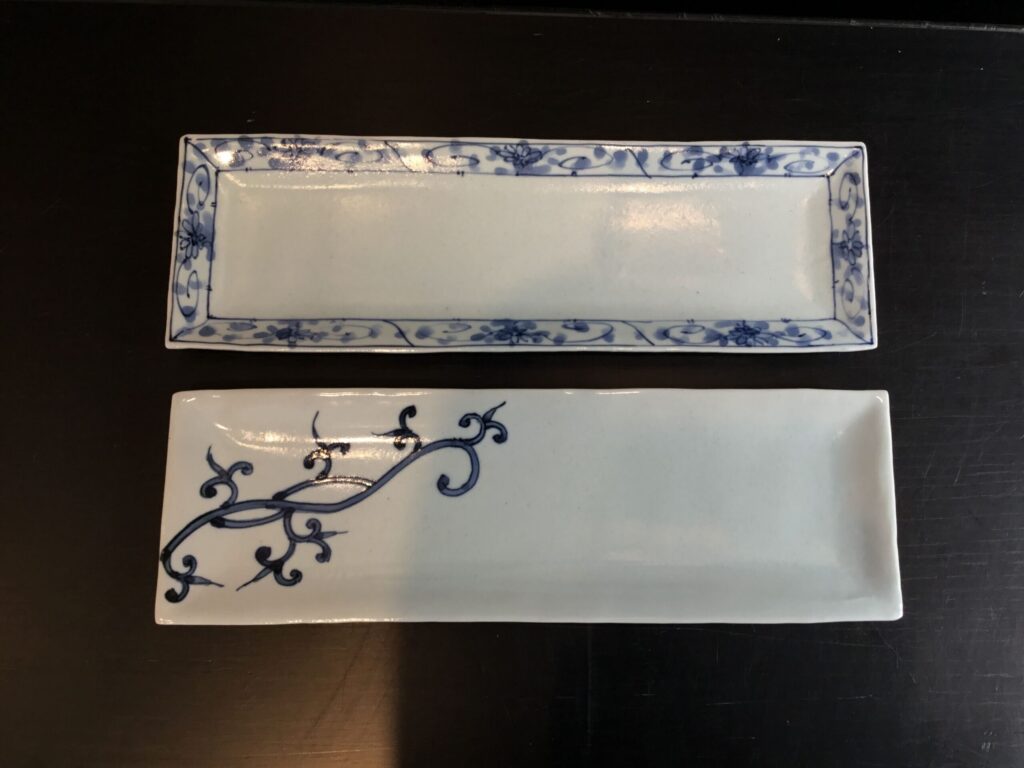 有田焼ブランド・アリタポーセリンラボの角皿2セット。天平窯・岡晋吾が手掛けたデザインと伸びやかな絵付けが、食卓を品よく演出します。