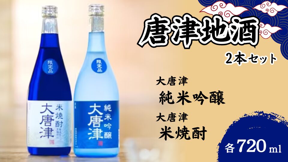 唐津の美しい海と砂浜をイメージしたセットです。上品な吟醸香と深みのある味わいを持つ純米吟醸酒は、軽く冷やして新鮮な魚介類と共に、黒麹仕込による深い味わいを持つ米焼酎は、ロックや水割りにて海鮮鍋やしゃぶしゃぶなどと共にお楽しみ下さい。 口当たり柔らかくのどごしなめらかな清酒・本格焼酎・梅酒を醸造している鳴滝酒造株式会社。郷土・唐津に愛され300年。時に「唐津のソウルドリンク」とも称される品を、ぜひ一度お試しください。 大唐津 純米吟醸 720ml×1本 大唐津 米焼酎 720ml×1本 ■注意事項/その他 ※直射日光を避け高温場所には保管しないで下さい。また、開封後はなるべく早くお召し上がりください。 ※お酒は20歳になってから。20歳未満の飲酒は法律で固く禁じられています。 ※妊娠中や授乳期の飲酒はお控え下さい。 ※飲酒運転は法律で禁止されています。 ※画像はイメージです。お礼品に、徳利・片口・ぐい呑み・グラス・桝などの酒器は含みません。 ※配達外エリア:離島 ■原材料 大唐津 純米吟醸:米(国産)・米麹(国産米) 大唐津 米焼酎:米(国産)・米麹(国産米) ■提供:鳴滝酒造(唐津市)