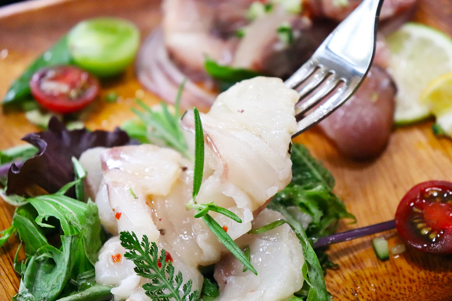 カルパッチョ専用にスライスされた真鯛は、身が引き締まり、程よい歯ごたえと上品な旨みが特徴です。別添えの特製ソースをかけるだけで、レストランのような一品が完成します。